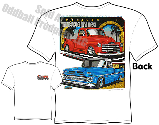 - Artwork is on back of 62-66 Chevrolet Trucks Tees. Small design on chest.