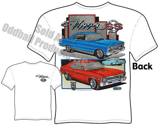 - Artwork is on back of 66 - 72 Nova T Shirt. Small design on chest.