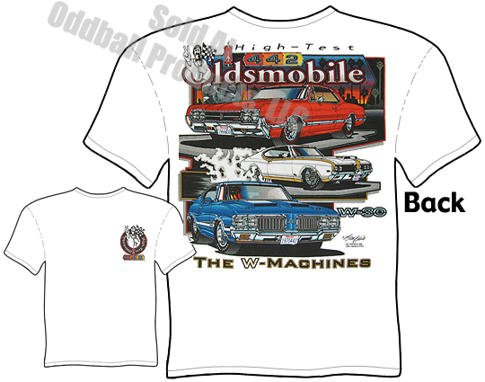 - Artwork is on back of 66-70 Oldsmobile T Shirt. Small design on chest.